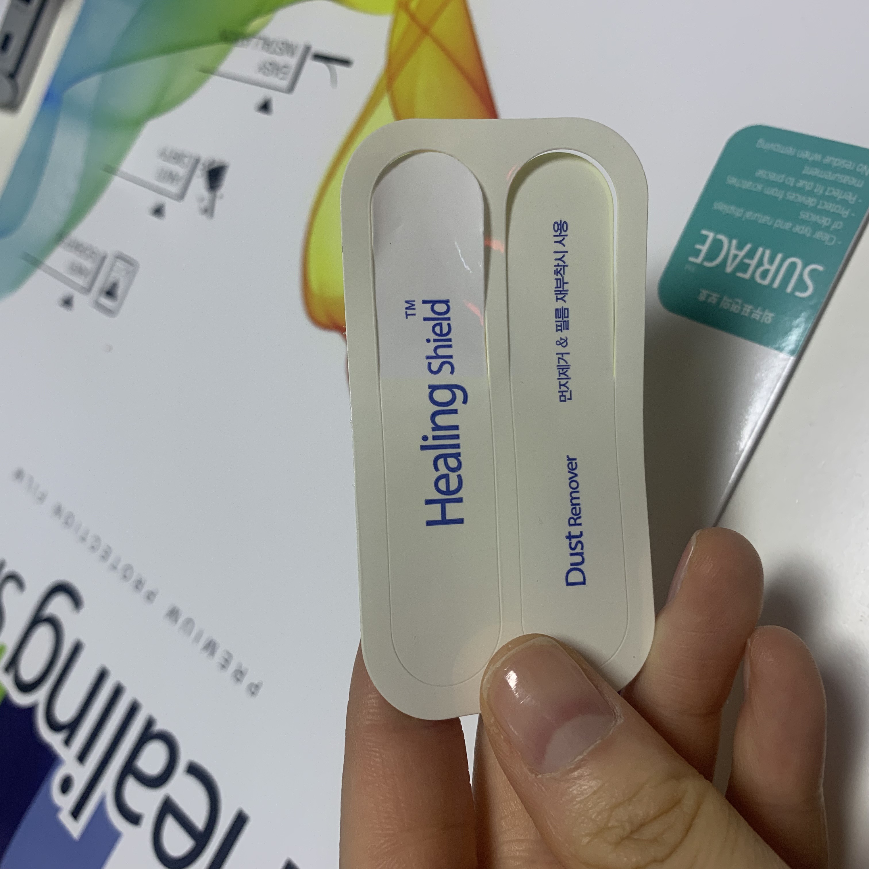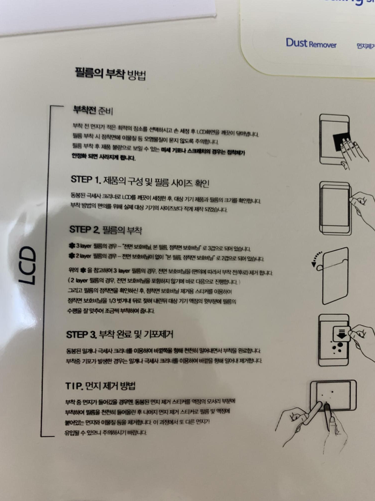 필름 3장과 밀대, 먼지제거스티커, 융 과 설명서로 되어있었어요